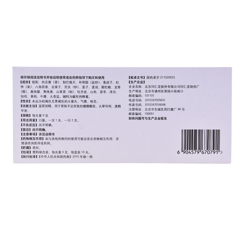 - 生产企业: 北京同仁堂股份有限公司同仁堂制药厂