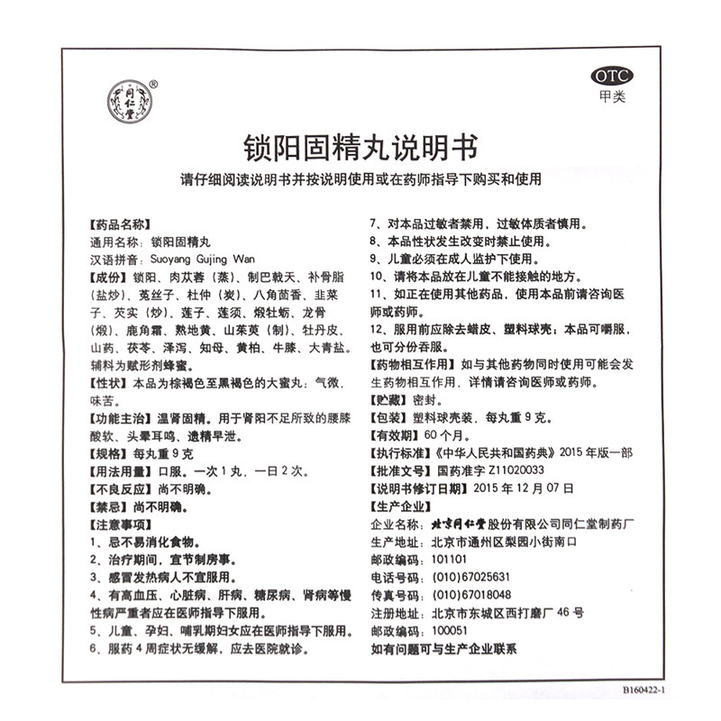 - 产品名称:同仁堂 锁阳固精丸 9g*10...
