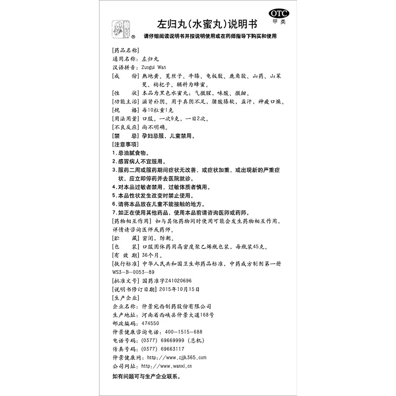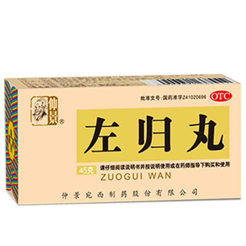 产品名称:仲景 左归丸 45g*1瓶/盒 品牌: 仲景 批准文号: 国药准字Z41020696 套餐类型: 生产企业: 河南省宛西制药股份有限公司 规格: 45g*1瓶/盒 类别: 中药 产品剂型: 丸剂 用法: 口服 使用剂量: 一次9克(约90粒),一日2次 药品通用名: 左归丸 药品名称: 左归丸 有效期: 36个月 药品分类: 非处方药