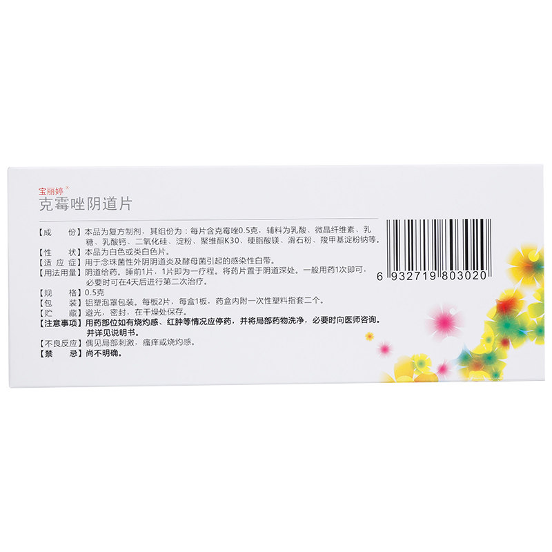 产品名称:宝丽婷 克霉唑阴道片 500m... 产品剂型: 片剂 使用剂量: 阴道给药。睡前1片,1片即为1疗程。 品牌: 宝丽婷 套餐类型: 有效期: 36个月 用法: 阴道给药 药品名称: 克霉唑阴道片 药品通用名: 克霉唑阴道片 批准文号: 国药准字H20066965 生产企业: 浙江圣博康药业有限公司 规格: 500mg*2片/盒 类别: 化学药
