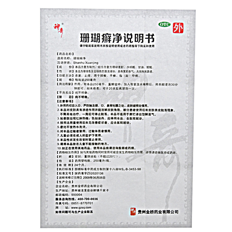 产品名称:神奇 珊瑚癣净 250ml*1瓶... 品牌: 神奇 药品名称: 珊瑚癣净 规格: 250ml*1瓶/盒 产品剂型: 外用液体剂 用法: 皮肤外用 药品分类: 非处方药 药品类别: 复方制剂 套餐类型: 标准装 使用剂量: 外用,取250ml温水稀释后浸泡 批准文号: 国药准字Z52020136 药品通用名: 珊瑚癣净 生产企业: 贵州金桥药业有限公司 有效期: 24个月